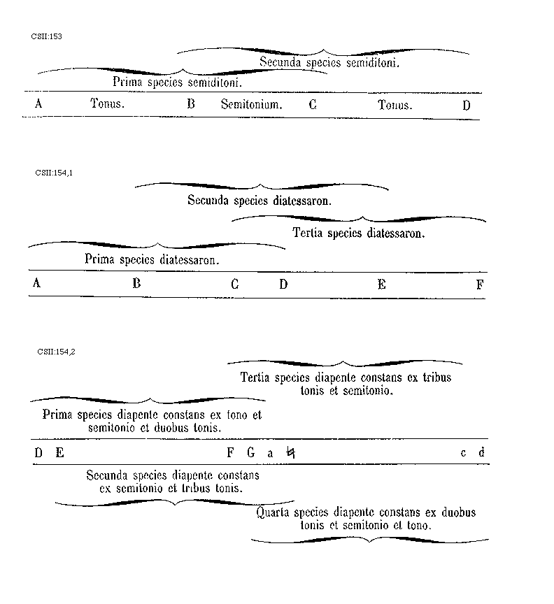 [CSII:154,2; text: Tertia species diapente constans ex tribus tonis et semitonio. Prima species diapente constans ex tono et semitonio et duobus tonis. D, E, F, G, a, [sqb], c d, Secunda species diapente constans ex semitonio et tribus tonis. Quarta species diapente constans ex duobus tonis et semitonio et tono.] [ABGURAM 01GF]