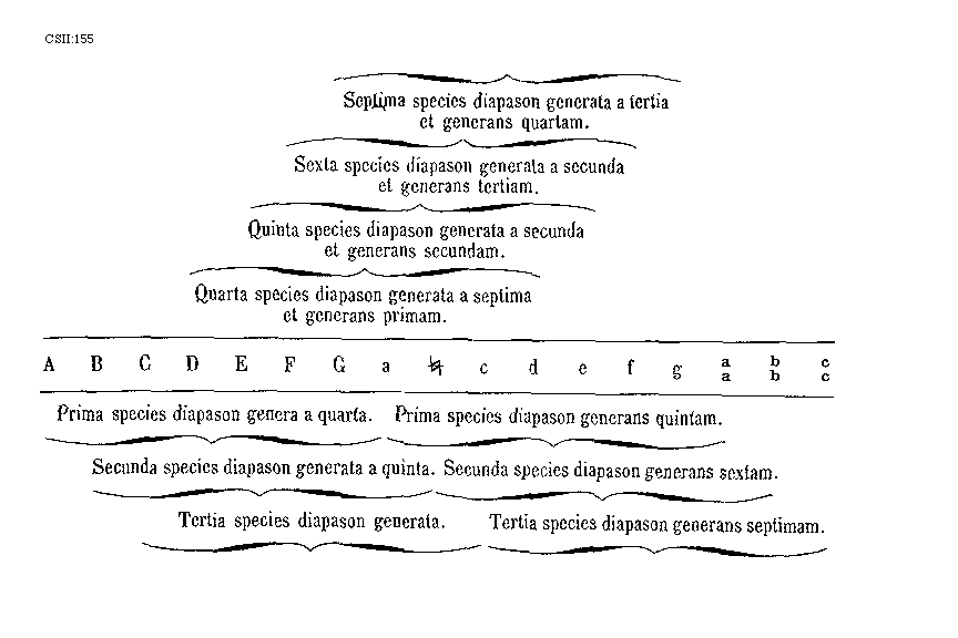 [155] [CSII:155; text: Septima species diapason generata a tertia et generans quartam. Sexta species diapason generata a secunda et generans tertiam. Quinta species diapason generata a secunda et generans secundam. Quarta species diapason generata a septima et generans primam. A, B, C, D, E, F, G, a, [sqb], c, d, e, f, g, aa, bb, cc, Prima species diapason genera a quarta. Prima species diapason generans quintam. Secunda species diapason generata a quinta. Secunda species diapason generans sextam. Tertia species diapason generata. Tertia species diapason generans septimam.] [ABGURAM 02GF]