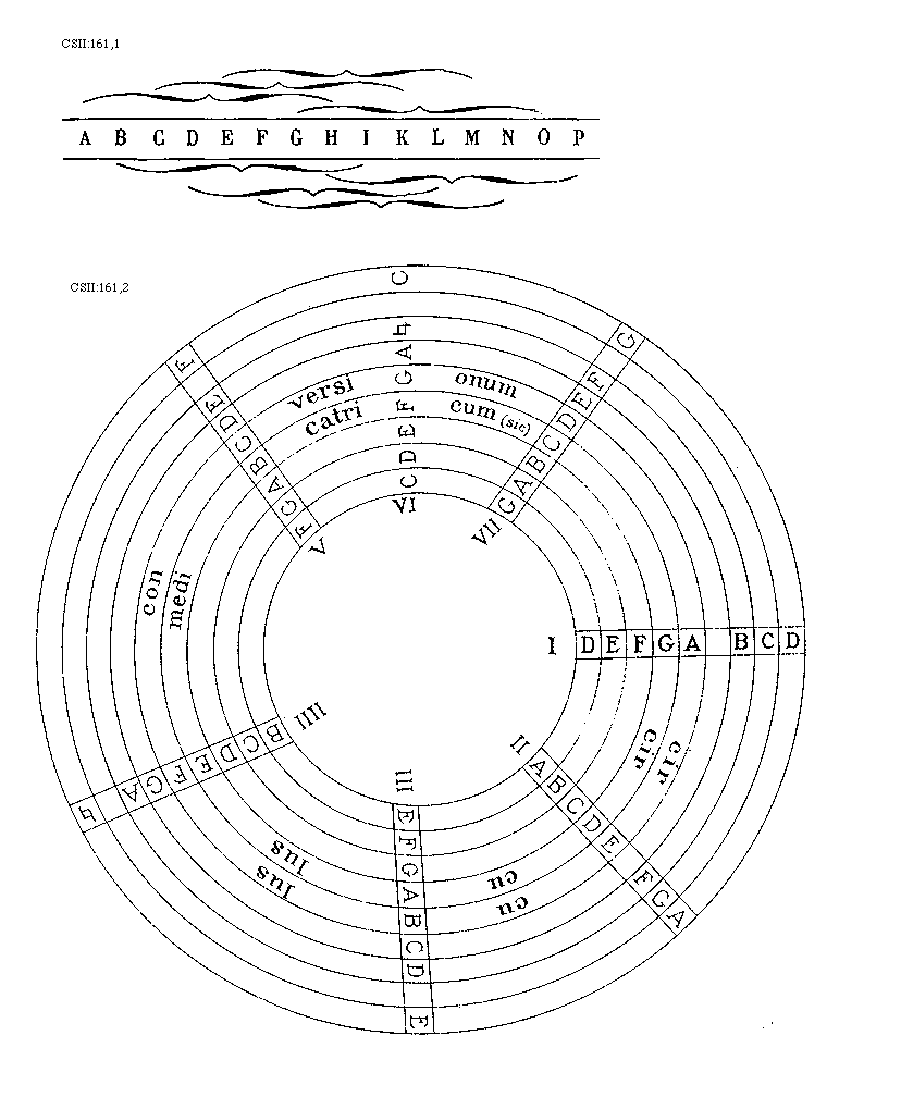 [CSII:161,2; text: I, II, III, IIII, V, VI, VII, A, B, C, D, E, F, G, [sqb], conversionem circulus, medicatricum (sic) circulus] [ABGURAM 04GF]
