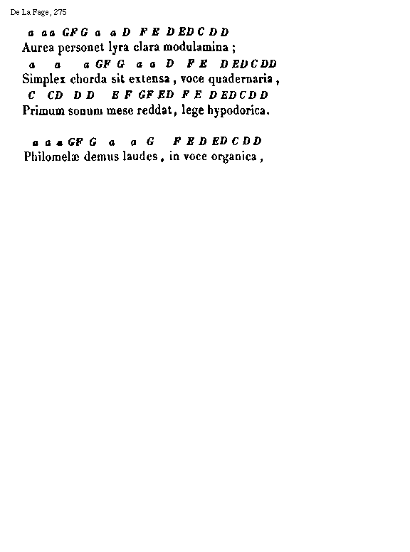 [De La Fage, 275; text: Aurea personet lyra clara modulamina; Simplex chorda sit extensa, voce quadernaria, Primum sonum mese reddat, lege hypodorica. Philomelae demus laudes, in voce organica, a, G, F, D, E, C] [ANOFRA3 01GF]