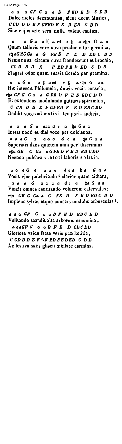 [276] [De La Fage, 276; text: Dulce melos decantantes, sicut docet Musica, Sine cujus arte vera nulla valent cantica. Quum telluris vere novo producuntur germina, Nemorosa circum circa frondescunt et brachia, Flagrat odor quam suavis florida per gramina. Hic latescit Philomela, dulcis vocis conscia, Et extendens modulando gutturis spiramina, Reddit voces ad aestivi temporis indicia. Instat nocti et diei voce per dulcisona, Soporatis dans quietem anni per discrimina, Necnon pulchra viatori laboris solatia. Vocis ejus pulchritudo clarior quam cithara, Vincit omnes cantitando volucrum catervulas; Implens sylvas atque cunctas modulis arbusculas. Volitando scandit alta arborum cacumina, Gloriosa valde facta veris prae laetitia, Ac festiva satis gliscit sibilare carmina. C, D, E, F, G, a, [sqb], c, d] [ANOFRA3 02GF]