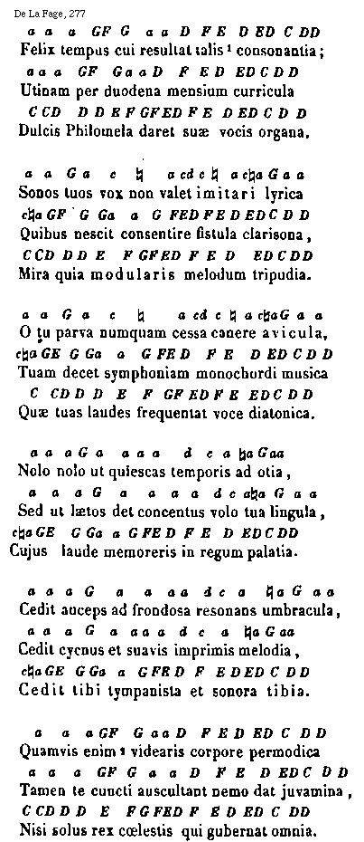 [277] [De La Fage, 277; text: Felix tempus cui resultat talis consonantia; Utinam per duodena mensium curricula, Dulcis Philomela daret suae vocis organa. Sonos tuos vox non valet imitari lyrica, Quibus nescit consentire fistula clarisona, Mira quia modularis melodum tripudia. O tu parva numquam cessa canere avicula, Tuam decet symphoniam monochordi musica, Quae tuas laudes frequentat voce diatonica. Nolo nolo ut quiescas temporis ad otia, Sed ut laetos det concentus volo tua lingula, Cujus laude memoreris in regum palatia. Cedit auceps ad frondosa resonans umbracula, Cedit cycnus et suavis imprimis melodia, Cedit tibi tympanista et sonora tibia. Quamvis enim videaris corpore permodica, Tamen te cuncti auscultant nemo dat juvamina, Nisi solus rex coelestis qui gubernat omnia. C, D, E, F, G, a, [sqb], c, d] [ANOFRA3 03GF]