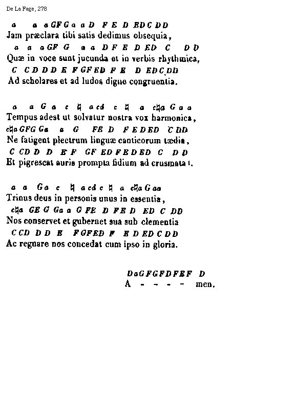 [278] [De La Fage, 278; text: Jam praeclara tibi satis dedimus obsequia, Quae in voce sunt jucunda et in verbis rhythmica, Ad scholares et ad ludos digne congruentia. Tempus adest ut solvatur nostra vox harmonica, Ne fatigent plectrum linguae canticorum taedia, Et pigrescat auris prompta fidium ad crusmata. Trinus deus in personis unus in essentia, Nos conservet et gubernet sua sub clementia, Ac regnare nos concedat cum ipso in gloria. Amen. C, D, E, F, G, a, [sqb], c, d] [ANOFRA3 04GF]