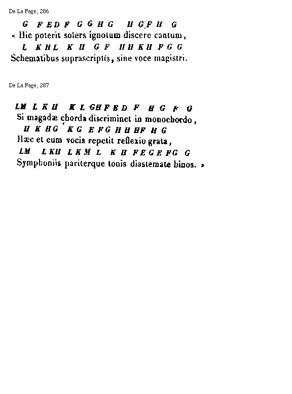 [287] [De La Fage, 287; text: Si magadae chorda discriminet in monochordo, Haec et eum vocis repetit reflexio grata, Symphoniis pariterque tonis diastemate binos. D, E, F, G, H, K, L, M] [ANOFRA3 05GF]