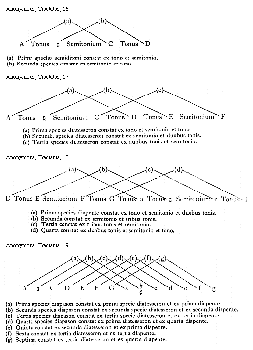 [Anonymous, Tractatus, 17; text: A, Tonus, [sqb], Semitonium, C, D, E, F, (a) Prima species diatesseron constat ex tono et semitonio et tono. (b) Secunda species diatesseron constat ex semitonio et duobus tonis. (c) Tertia species diatesseron constat ex duobus tonis et semitonio.] [ANOLAF 01GF]