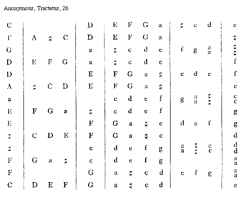 Dispositio igitur tonorum et semitoniorum per litteras determinatas qua perfecti utuntur musici talis est: Ponuntur pri- (V 26) mitus duo toni, postea semitonium. Deinde duo toni, postea semitonium. Tertio loco adiungitur tritonus, qui super F naturaliter et ubique reperitur, deinde semitonium. postea duo toni et semitonium, deinde tritonus invenitur, qui naturaliter, ut dictum est, super f reperitur, deinde semitonium et tonus ad ultimum.