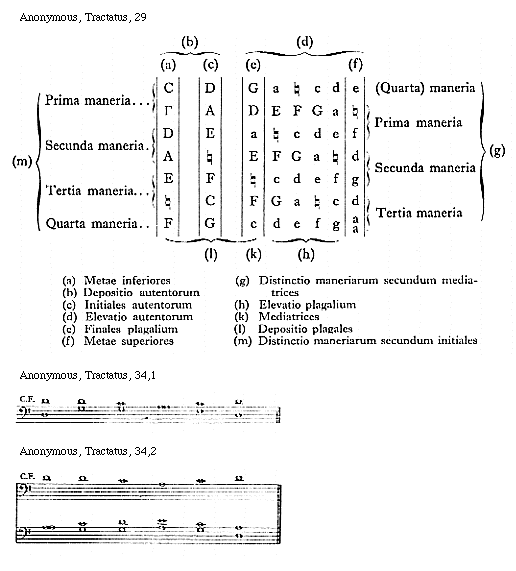 Sub prima maneria continentur duo modi vel toni, scilicet, et primus et secundus, sub secunda duo, scilicet, et tertius et quartus, sub tertia duo, scilicet, et quintus et sextus, sub quarta duo, scilicet, et septimus et octavus. Sub prima ergo maneria continentur prothus autentus et plagalis eius. Prothus autentus dicitur quasi auctoralis et primus, plagalis vero quae de regione autenti est, terminatur enim in eisdem litteris in quibus (P: Finis) et autentus suae manerie. Sub secunda continetur deuterus autentus et plagalis eius, sub tertia tritus autentus et plagalis eius, sub quarta duo, scilicet, tetrardus autentus et plagalis eius.