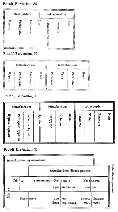 [Frutolf, Breviarium, 31; text: tetrachordum synemmenon, tetrachardum diezeugmenon, Nete diezeugmenon, Mese, Trite synemmenon, Paranete synemmenon, Nete synemmenon, Paramese, Paranete diezeugmenon, Triste diezeugmenon] [FRUBRE 01GF]