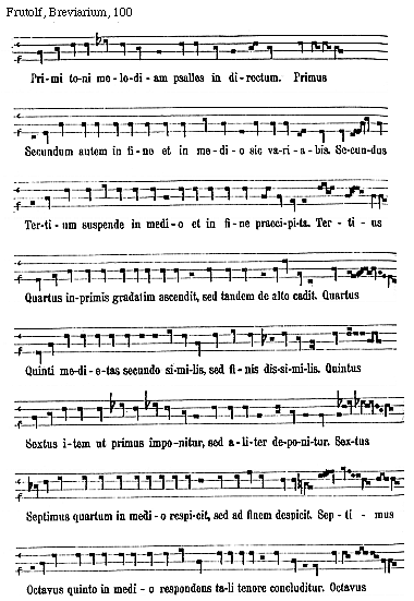 [100] [Frutolf, Breviarium, 100, text: Primi toni melodiam psalles in directum. Primus, Secundum autem in fine et in medio sic variabis. Secundus, Tertium suspende in medio et in fine praecipita. Tertius, Quartus inprimis gradatim ascendit, sed tandem de alto cadit. Quartus, Quinti medietas secundo similis, sed finis dissimilis. Quintus, Sextus item ut primus imponitur, sed aliter deponitur. Sextus, Septimus quartum in medio respicit, sed ad finem despicit. Septimus, Octavus quinto in medio respondens tali tenore concluditur. Octavus] [FRUBRE 07GF]