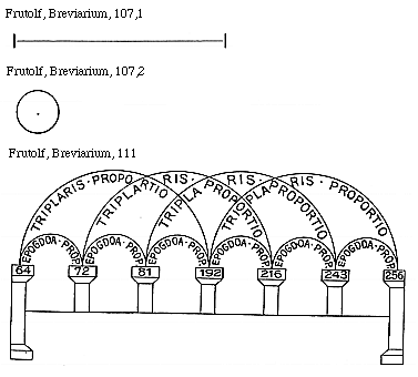 [Frutolf, Breviarium, 111; text: Triplaris proportio, Epogdoa proportio, 64, 72, 81, 192, 216, 243, 256] [FRUBRE 08GF]
