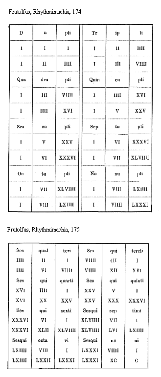 [Frutolfus, Rhythmimachia, 174; text: Dupli, Tripli, Quadrupli, Quincupli, Sescupli, Septupli, Octupli, Nonupli, I, II, III, IIII, V, VI, VII, VIII, VIIII, XVI, XXV, XXXVI, XLVIIII, LXIIII, LXXXI] [FRURIT 01GF]