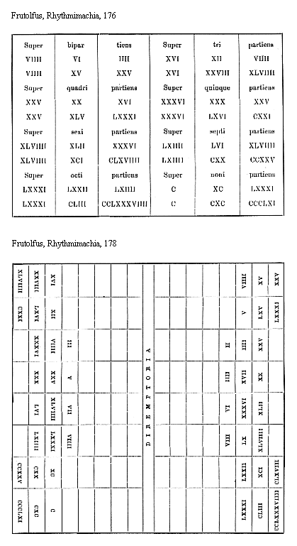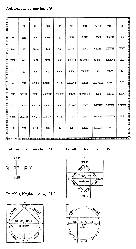 [Frutolfus, Rhythmimachia, 191,2; text: C, V, VIIII, XV, XXV, XLV, Arithmetica, Geometrica, Armonica medietas.] [FRURIT 03GF]