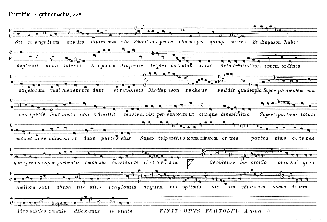 [196] Quia uero in facienda uictoria aliqui disponuntur termini ex genere superpartienti, in quibus musicae proportiones non possunt inueniri, sicut supra praelibauimus, non inutile arbitror ostendere, quomodo et in ipsis utcumque terminis musica quoque speculatio deesse non possit. Dicit domnus Wido in micrologo suo talem distributionem neumarum in componendo cantu obseruandam, ut cum neumae tum eiusdem soni repercussione, tum duorum aut plurium connexione fiant, semper tamen aut in numero uocum aut in ratione tonorum ipse neumae alterutrum conferantur atque respondeant, nunc aequae aequis, nunc duplae uel triplae simplicibus, atque alias collatione sesqualtera uel sesquitercia. Cum per has quidem proportiones diuisio disponatur monocordi, hic tamen intendit ostendere, quod sicut in monocordo istis mensuris praedictae consonantiae colliguntur, ita in armonia neumae, quae non nisi ipsis consonantiis fiunt, etiam ipsis praecipue proportionibus consonent [2] et conferantur. Sicut ergo ille proportiones per diuersos numeros diuerse sibi conferuntur, sic in cantibus secundum diuersos numeros sonorum non consonantiarum diuersitatem uidere possumus proportionum. Vnde et numeros sonorum, seu consonantia sit seu non sit, ita considerare possumus, ut cum habeant duplam, sesqualteram uel sesquiterciam proportionem, etiam inuenire possimus triplam, quadruplam et quincuplam ac deinceps, superbipartientem quoque et supertripartientem seu superquadripartientem ac deinceps, sicque fiat, ut ex genere superpartienti constituta uictoria musica quoque ibi non desit per proportiones tantum sonorum, non consonantiarum. Quod ut exemplo manifestius fiat, quasdam symphonias secundum has sonorum proportiones compositas subiecimus.