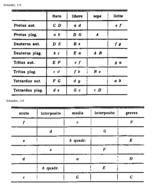[Schneider, 115; text: Raro, libere, sepe, licite, Protus autentus, Protus plagis, Deuterus autentus, Deuterus plagis, Tritus autentus, Tritus plagis, Tetrardus autentus, Tetrardus plagalis, A, B, C, D, E, F, g, a, b, c, d, e, f] [SCHANO 02GF]