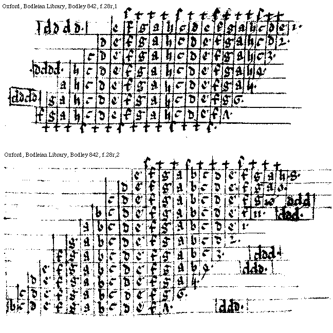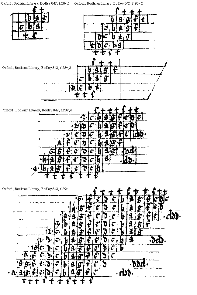 [Oxford, Bodleian Library, Bodley 842, f.28v,4; text: s, t, c, [sqb], a, g, f, e, d, [der], [ddem]. 3. .2. .1. 7 6. .5. .4.] [TDMUS3 09GF]