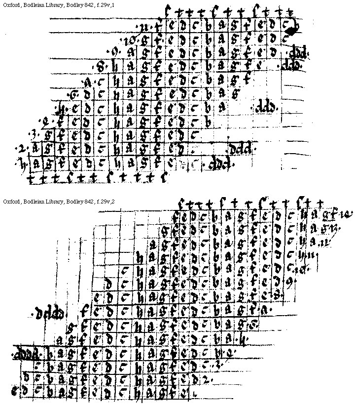 [Oxford, Bodleian Library, Bodley 842, f.29v,2; text: s, t, f, e, d, c, [sqb], b, a, g, .[ddem][der]. .14. .13. .12. .11. .10. .9. .8. .7. .6. .5. .4. .3. .2. 1] [TDMUS3 10GF]