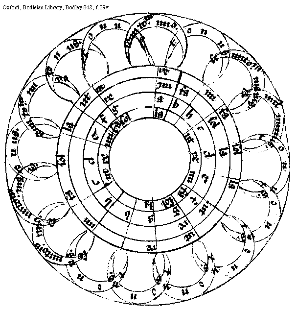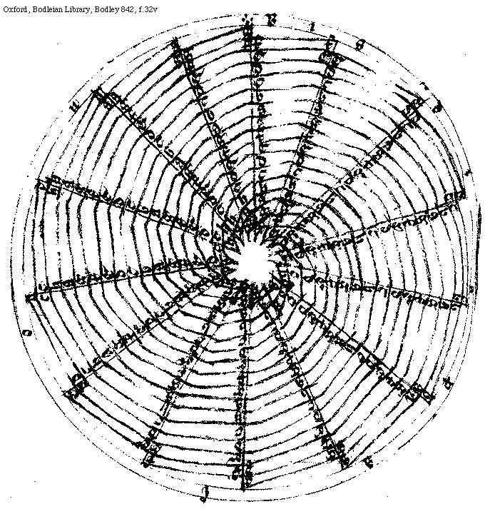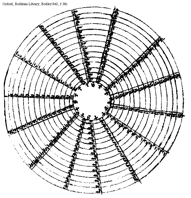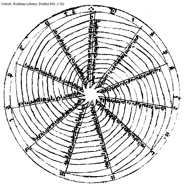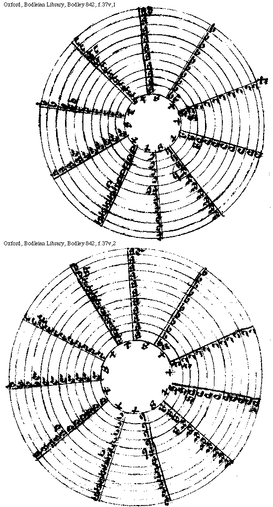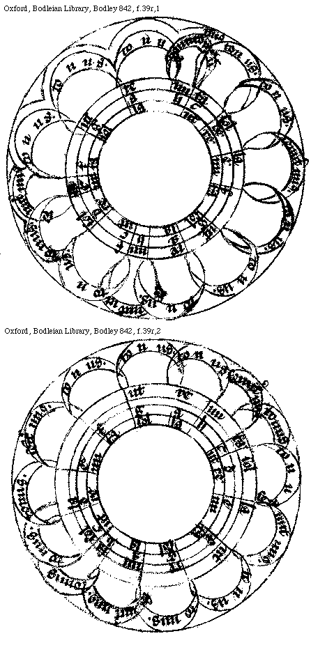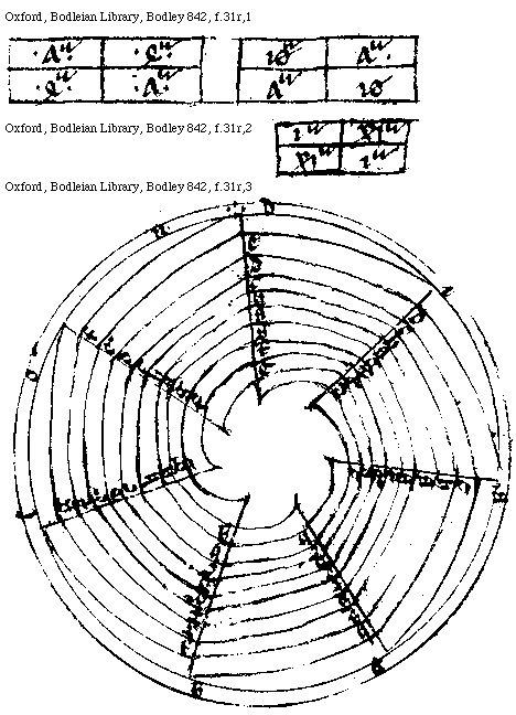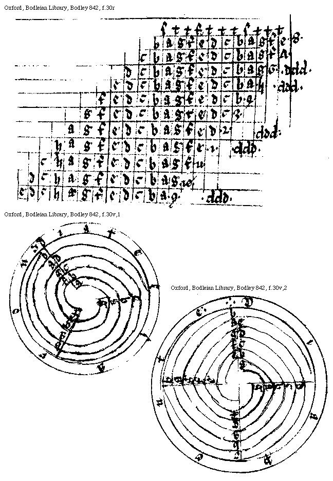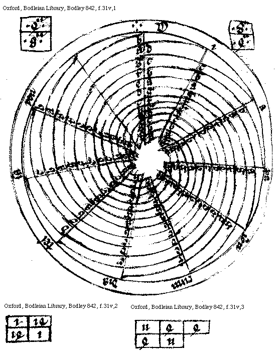 Tabule rotunde; alie notant coniunccionem laterum superior et inferior que sunt plana capitibus prioribus et posterioribus in equalitate quadam ordinatis quorum priora infra sunt in circulis posteriora; extra [f.41v] alie notant coniunccionem capitum priorum et posteriorum lateribus circuemitibus foris et extra. unde ille extra et intra plane sunt. Inequalitates autem capitum incluse sunt et in equalitatem conuertuntur fine prime speciei se complanante secunde cum se vertendo in circulum; ultimam notulam facit primam. et primam; ultimam. hoc exemplo. Notetur ordo specierum diapason. pona<m>us ultimam in primam secundum .[roe]. in .f. Ecce primam incipiet in .f. et finiet in .d. In specie secunda ponamus primam .d. in ultima. In tercia. ponamus priores .c. et .d. in posteriores. In quarta ponamus .[sqb].c.d. priores in posteriores. et sic de ceteris fiat. et sic planabitur totus ordo. ut non sit differencia inter speciem et speciem. nisi in diuersi secundum inicijs et finibus. cum unaqueque incipiat in .e. et finiat in .d.