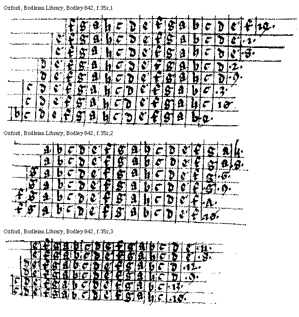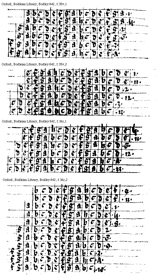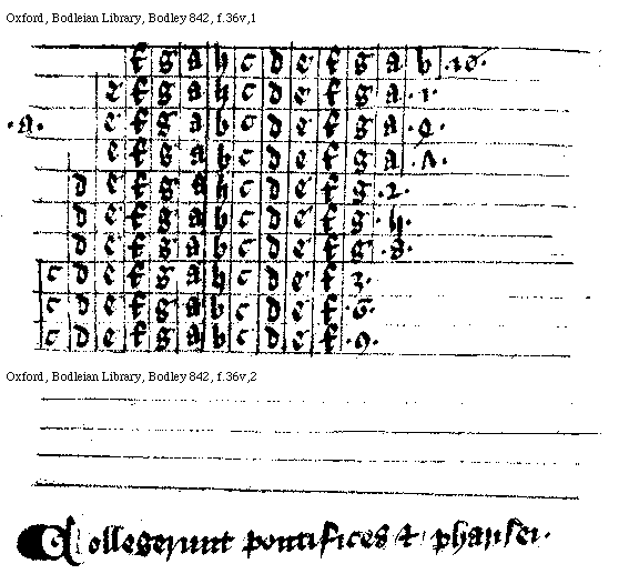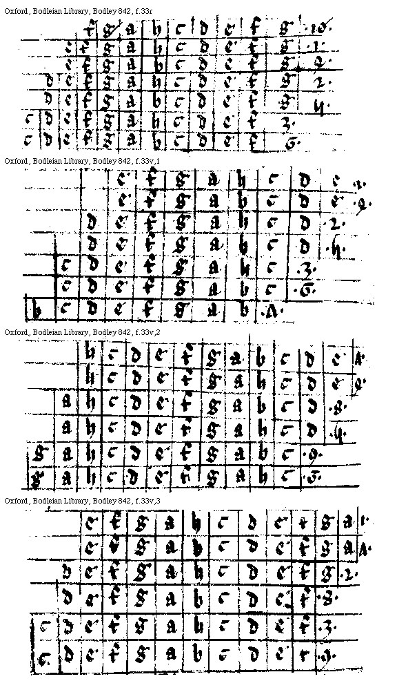 [Oxford, Bodleian Library, Bodley 842, f.36v,1; text: f, g, a, b, [sqb], c, d, e, .10. .1. .4. .7. .2. .5. .8. 3. .6. .9.] [TDMUS3 20GF]