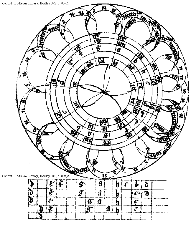 [Oxford, Bodleian Library, Bodley 842, f.31r,3; text: diapason, [roe], e, f, g, a, b, [sqb], c, d] [TDMUS3 12GF]