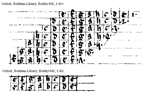 [Oxford, Bodleian Library, Bodley 842, f.41v; text: e, f, g, a, [sqb], c, d, [roe], 1. .2. .3. .4. .5. .6. .7.] [TDMUS3 27GF]