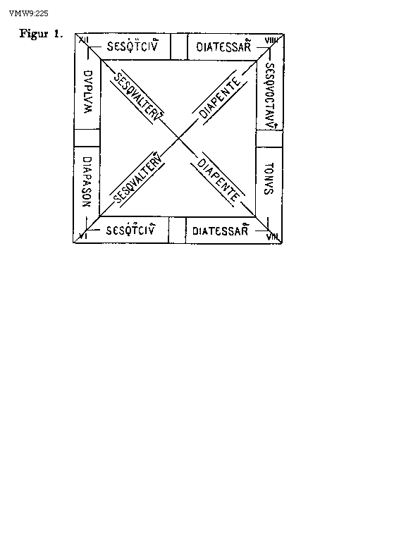 [225] [VMW9:225; text: Figur 1., XII, VIIII, VIII, VI, SESQVOCTAVVM, DIATESSARON, TONVS, DIAPASON, DVPLVM, DIAPENTE, SESQVALTERVM, SESQVITERTIVM] [WFANON1 01GF]
