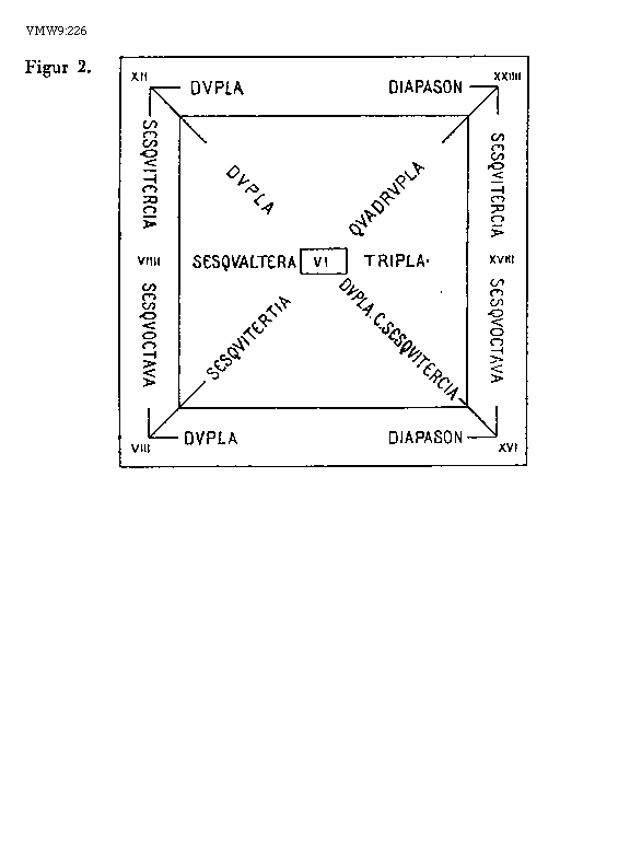 [226] [VMW9:226: Figur 2. XII, XXIIII, VIII, XVI, VI, VIIII, XVIII, SESQVITERCIA, SESQVOCTAVA, DVPLA, DIAPASON, SESQVITERTIA, QVADRVPLA, SESQVALTERA, TRIPLA, DVPLA CUM SESQVITERCIA] [WFANON1 02GF]