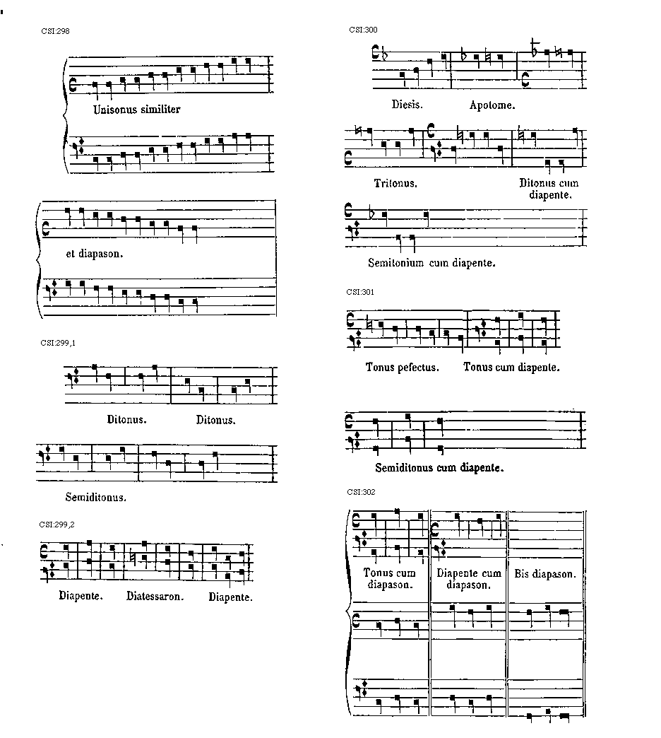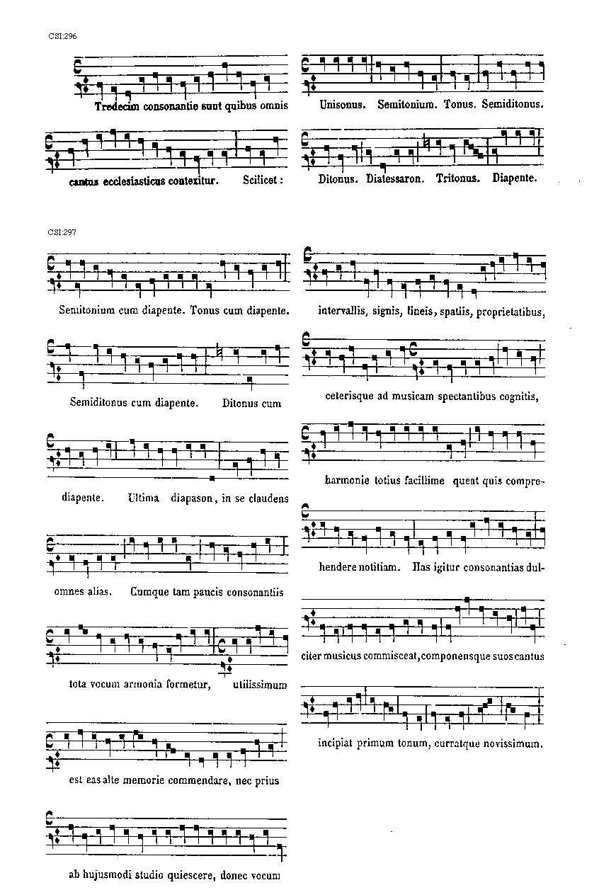 [297] [CSI:297; text: Semitonium cum diapente. Tonus cum diapente. Semiditonus cum diapente. Ditonus cum diapente. Ultima diapason, in se claudens omnes alias. Cumque tam paucis consonantiis tota vocum armonia formetur, utilissimum est eas alte memorie commendare, nec prius ab hujusmodi studio quiescere, donec vocum intervallis, signis, lineis, spatiis, proprietatibus, ceterisque ad musicam spectantibus cognitis, harmonie totius facillime queat quis comprehendere notitiam. Has igitur consonantias dulciter musicus commisceat, componensque suos cantus incipiat primum tonum, curratque novissimum.] [ANO1TRA 01GF]