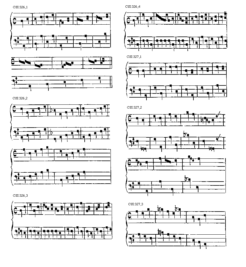 Si cantus ascendat ad diapente, hoc est tres [326] tonos cum dimidio, discantus debet incipere in diapason, et ascendere unum tonum, et erit diapente, ut hic patet:
