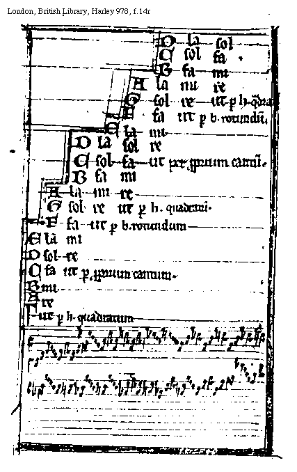 [f.14r] [London, British Library, Harley 978, f.14r; text: ut, re, mi, fa, sol, la, per [sqb]. quadratum, per proprium cantum, per b. rotundum, [Gamma], A, B, C, D, E, F, G] [ANOINT 01GF]