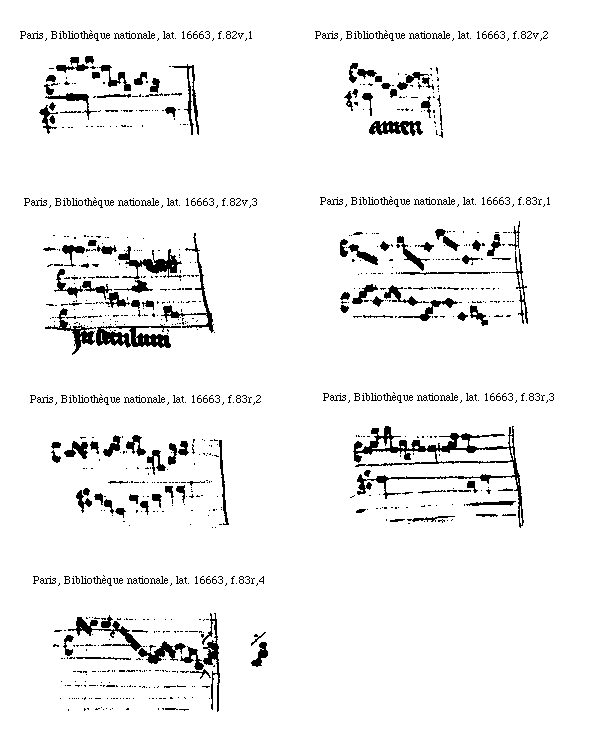 Et nota quod tam concordancie. quam discordancie: possunt suni: in infinitum. ut diapente cum diapason [diatesseron cum diapason ut hic. Et sic in duplici diapason add. supra in marg.] et triplici: si possibile esset in uoce. Item sciendum: quod omnis inperfecta discordancia in mediate ante concordanciam: bene concordat. Discantus autem aut fit cum littera: aut sine et cum littera. Si cum [Sicut ante corr.] littera: hoc est dupliciter. Cum eadem uel cum diuersis. Cum eadem littera fit discantus: in cantilenis rondellis et cantu aliquo eclesiastico Cum diuersis litteris fit discantus. ut in motetis qui habent triplum uel tenorem. quia tenor cuidam littere: equipollet. Cum littera [et add. supra lin.] sine fit discantus in conductis et discantu aliquo ecclesiastico qui inproprie organum appellatur. Et nota quod hiis omnibus est idem modus operandi excepto in conductis. Quia in omnibus aliis primo accipitur cantus aliquis prius factus. Qui tenor dicitur: eo quod discantum tenet et [f.82r] ab ipso ortum habet: In conductis uero: non sic sed fiunt ab eodem cantus: et discantus. Sed discantus dicitur: dupliciter. primo dicitur discantus quasi diuersorum [diauersorum ante corr.] cantus: secundo dicitur discantus: quasi de cantu sumptus. Modi autem operandi in istis: talis est processus. aut discantus incipit in unissono [[c]] cum tenore ut hic apparet.