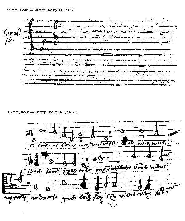 [Oxford, Bodleian Library, Bodley 842, f.61r,2; text: O Lord consider my distresse and now with speed some pyty take: my [[falts and]] sinns deface my falts redresse good Lord for thy great mercy sake add. m.rec.] [FRACOMO 01GF]