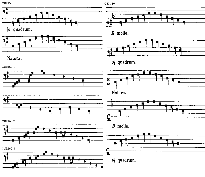 In c sol fa fiunt due mutationes, scilicet sol fa; fa sol; ambe descendentes de b molli in [sqb] quadro et e converso, ut hic patet exemplis: