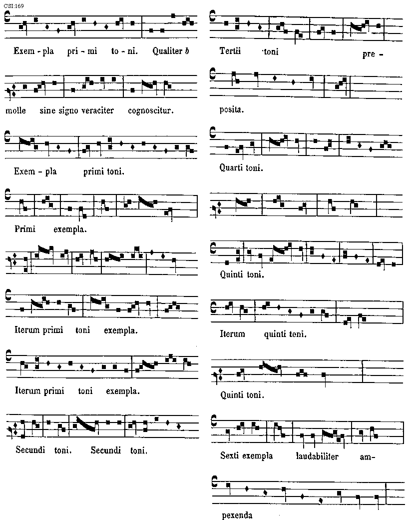 [CSI:169; text: Exempla primi toni. Qualiter b molle sine signo veraciter cognoscitur. Exempla primi toni. Primi exempla. Iterum primi toni exempla. Secundi toni. Tertii toni preposita. Quarti toni. Quinti toni. Iterum quinti toni. Sexti exempla laudabiliter ampexenda] [GARINT 08GF]