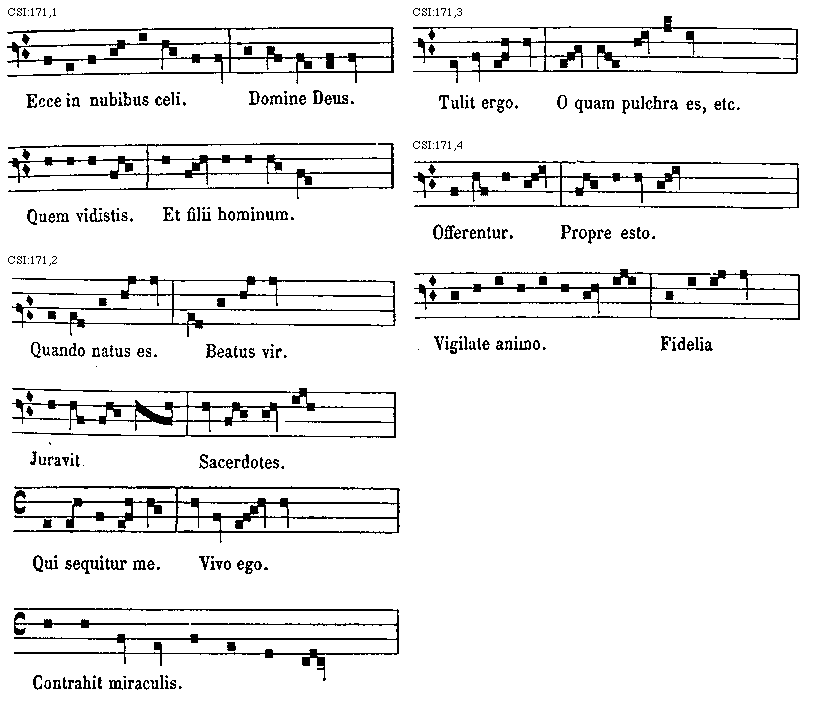 [CSI:171,2; text: Quando natus es. Beatus vir. Juravit. Sacerdotes. Qui sequitur me. Vivo ego. Contrahit miraculis.] [GARINT 10GF]