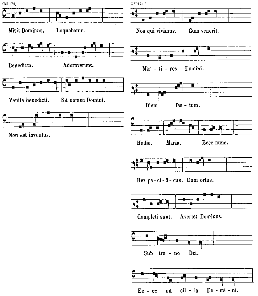 [174] [CSI:174,1; text: Misit Dominus. Loquebatur. Benedicta. Adoraverunt. Venite benedicti. Sit nomen Domini. Non est inventus.] [GARINT 13GF]