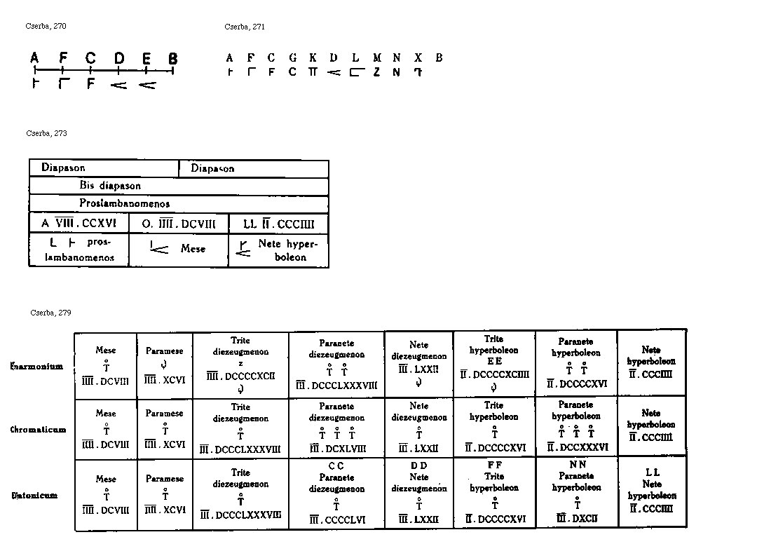 [Cserba, 279; text: Enharmonium, Mese, To, IIII[macron supra lin.].DCVIII, Paramese, IIII[macron supra lin.].XCVI, Trite diezeugmenon, z, IIII[macron supra lin.].DCCCCXCII, Paranete diezeugmenon, III[macron supra lin.].DCCCLXXXVIII, Nete diezeugmenon, III[macron supra lin.].LXXII, Trite hyperboleon, EE, II[macron supra lin.].DCCCCXCIIII, Paranete hyperboleon, II[macron supra lin.].DCCCCXVI, Nete hyperboleon, II[macron supra lin.].CCCIIII, Cromaticum, III[macron supra lin.].DCXLVIII, II[macron supra lin.].DCCCCXVI, II[macron supra lin.].DCCXXXVI, Diatonicum, CC, III[macron supra lin.].CCCCLVI, DD, FF, NN, III[macron supra lin.].DXCII, LL] [IERTDM2 01GF]