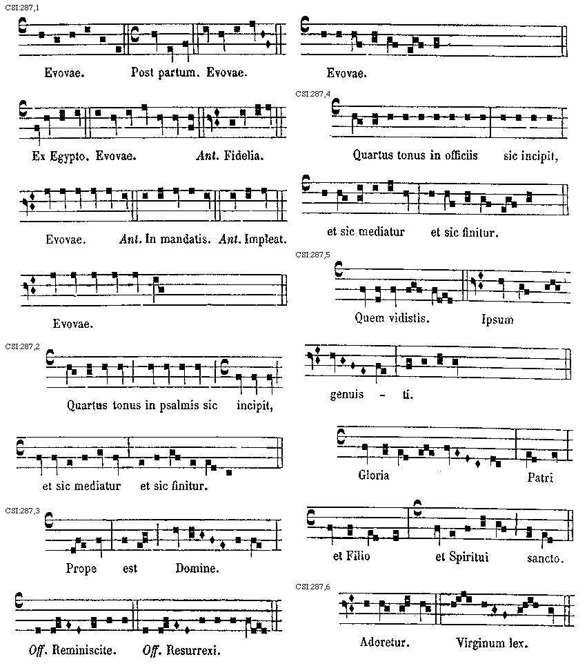 [287] [CSI:287,1; text: Evovae. Post partum. Ex Egypto. Antiphona Fidelia. Antiphona In mandatis. Antiphona Impleat.] [PETTRA 05GF]