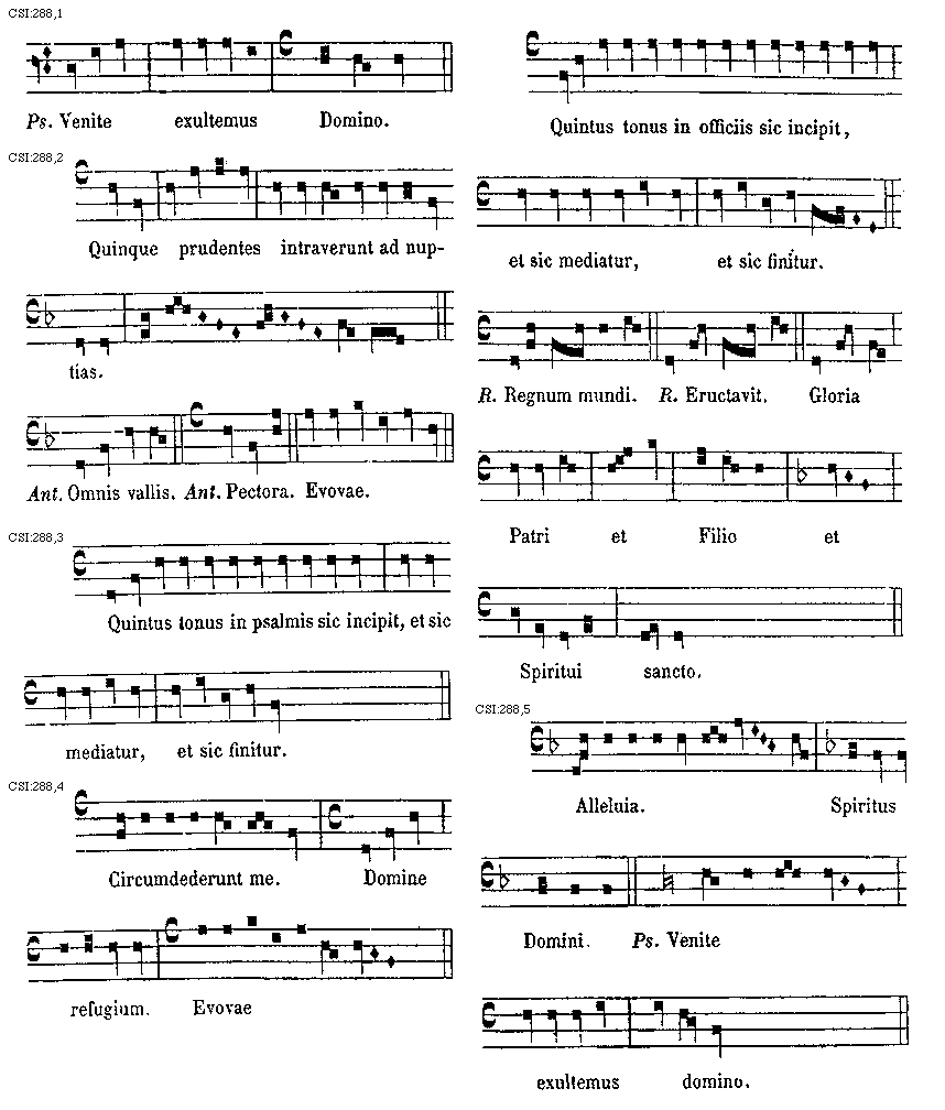 [CSI:288,3; text: Quintus tonus in psalmis sic incipit, et sic mediatur, et sic finitur.] [PETTRA 06GF]