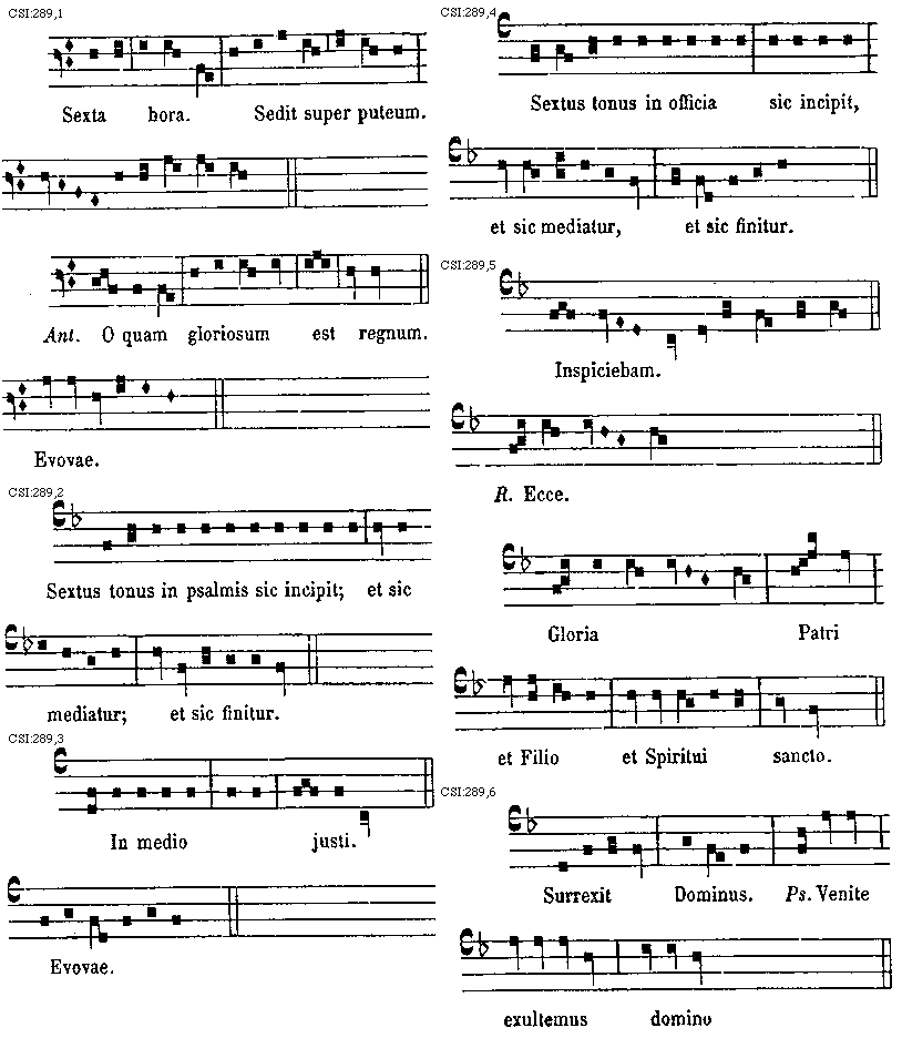 [CSI:289,2; text: Sextus tonus in psalmis sic incipit; et sic mediatur; et sic finitur.] [PETTRA 07GF]