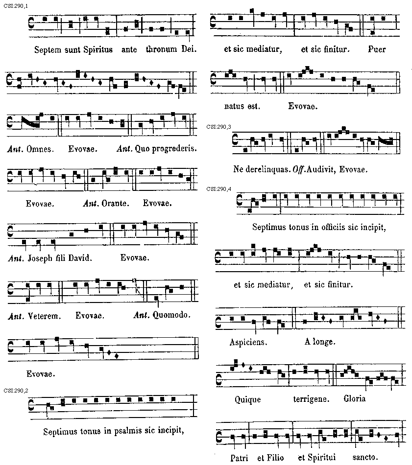 [CSI:290,4; text: Septimus tonus in officiis sic incipit, et sic mediatur, et sic finitur. Aspiciens. A longe. Quique terrigene. Gloria Patri et Filio et Spiritui sancto.] [PETTRA 08GF]