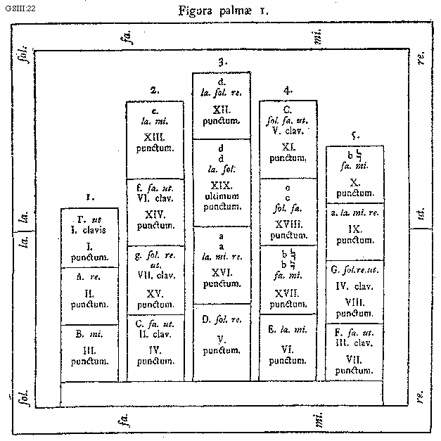 [22] [GSIII:22; text: Figurae palmae 1. ut. re. mi. fa. sol. la. 1. 2. 3. 4. 5. I clavis, II. clav., III. clav., IV. clav., V. clav., VI. clav., VII. clav., I. punctum.,II. punctum., III. punctum., IV. punctum., V. punctum., VI. punctum., VII. punctum., VIII. punctum., IX. punctum., X. punctum., XI. punctum., XII. punctum., XIII. punctum., XIV. punctum., XV. punctum., XVI. punctum., XVII. punctum., XVIII. punctum., XIX. ultimum punctum. [Gamma]. ut, A. re., B. mi., e. la. mi., f. fa. ut., g. sol. re. ut., C. fa. ut., d. la. sol. re., dd la. sol., aa la. mi. re., D. sol. re,.C. sol. fa. ut., cc sol. fa., b[sqb]b[sqb] fa. mi., E. la. mi., b[sqb] fa. mi., a. la. mi. re., G. sol. re. ut., F. fa. ut.] [SALSCI 01GF]