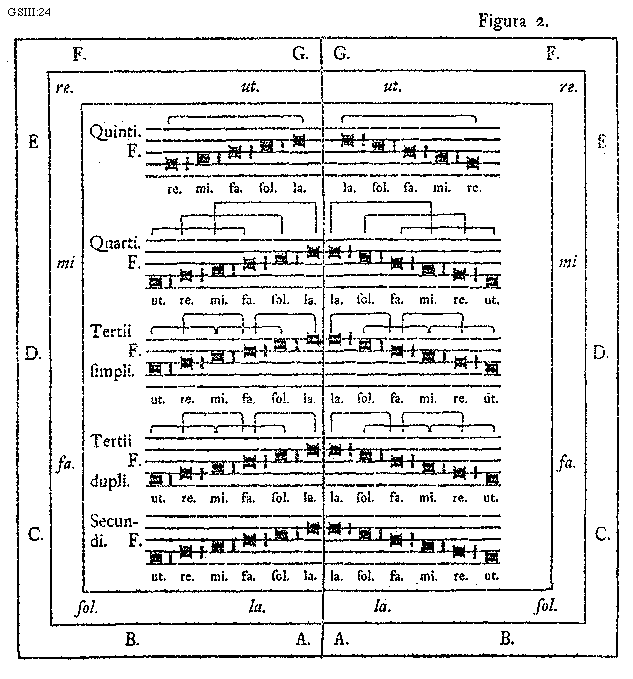 [GSIII:24; text: Figura 2. G. F. E, D. C. B. A. ut. re. mi. fa. sol. la. Quinti. Quarti. Tertii simpli. Tertii dupli. Secundi.] [SALSCI 02GF]