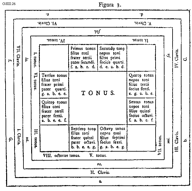 [GSIII:26; text: Figura 3., a. b. C. d. e. f. G. Prima Clavis. Secunda Clavis. Tertia Clavis. Quarta Clavis. Quinta Clavis. Sexta Clavis. Septima Clavis. ut. re. mi. fa. sol. la. Primus tonus, filius toni, frater tertii, pater secundi. secundus tonus, nepos toni, filius primi, socius quarti. g. Quartus tonus, filius tertii, socius sexti. Sextus tonus, filius quinti, socius octavi. Octavus tonus, filius septimi, Septimus tonus, frater quinti, pater octavi. Quintus tonus, pater sexti. Tertius tonus, frater primi, pater quarti. Tonus.] [SALSCI 03GF]