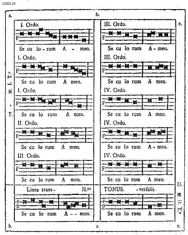 [GSIII:29; a. b. e. D. Responsoria Secundo Tono. F. Responsoria Primo Tono. Primus Ordo. Secundus Ordo. Tertius Ordo. Quartus Ordo. Seculorum Amen. Secundus Tonus. Linea Transversalis.] [SALSCI 04GF]