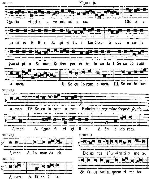 [GSIII:47; text: Figura 8. Quarta vigilia venit ad eos. Gloria patri et filio et spiritui sancto: sicut erat in principio et nunc et semper et in secula I. II. III. Seculorum amen.] [SALSCI 10GF]