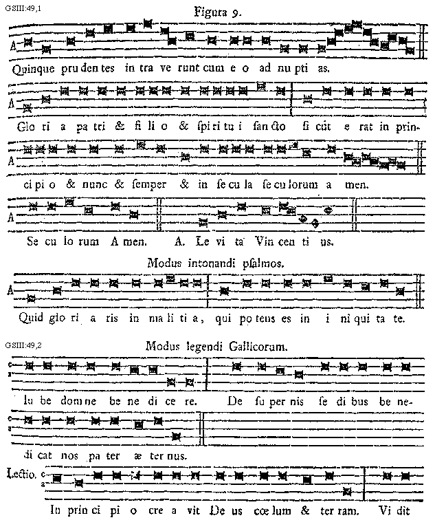 [49] [GSIII:49,1; text: Figura 9. Quinque prudentes intraverunt cum eo ad nuptias. Gloria patri et filio et spiritui sancto sicut erat in principio et nunc et semper et in secula seculorum amen. Seculorum Amen. Antiphona, Levita Vincentius. Modus intonandi psalmos. Quid gloria in malitia, qui potens es in iniquitate.] [SALSCI 11GF]