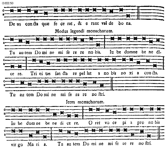 [50] [GSIII:50; text: Deus cuncta quae fecerat, et erant valde bona. Modus legendi monachorum. Tu autem Domine miserere nobis. Iube domne benedicere. Trinitas sancta repellat a nobis noxia cuncta. Tu autem Domine miserere nostri. Item monachorum. Oret voce pia pro nobis virgo Maria.] [SALSCI 12GF]