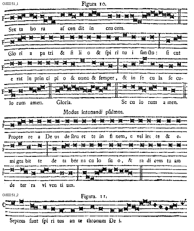 [51] [GSIII:51,1; text: Figura 10. Sexta hora ascendit in crucem. Gloria patri et filio et spiritui sancto: sicut erat in principio et nunc et semper, et in secula seculorum amen. Gloria. Seculorum amen. Modus intonandi psalmos. Propterea Deus destruet te in finem, evellet te et emigrabit te de tabernaculo suo, et radicem tuam de terra viventium.] [SALSCI 13GF]