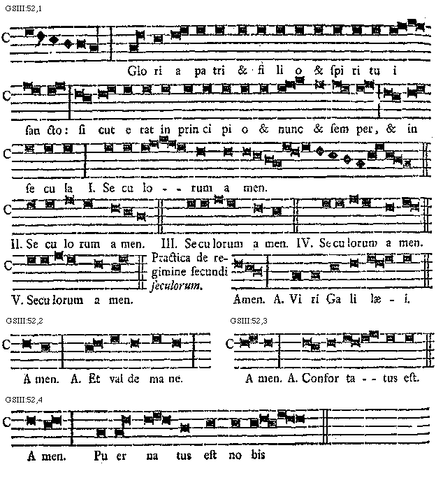 [52] [GSIII:52,1; text: Gloria patri et filio et spiritui sancto: sicut erat in principio et nunc et semper, et in secula I. II. III. IV. V. Seculorum amen. Practica de regimine secundi seculorum. Amen. Antiphona, Viri Galilaei.] [SALSCI 14GF]