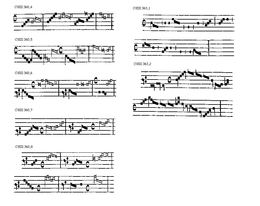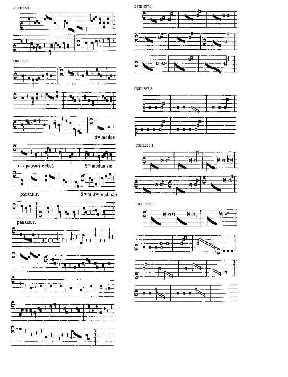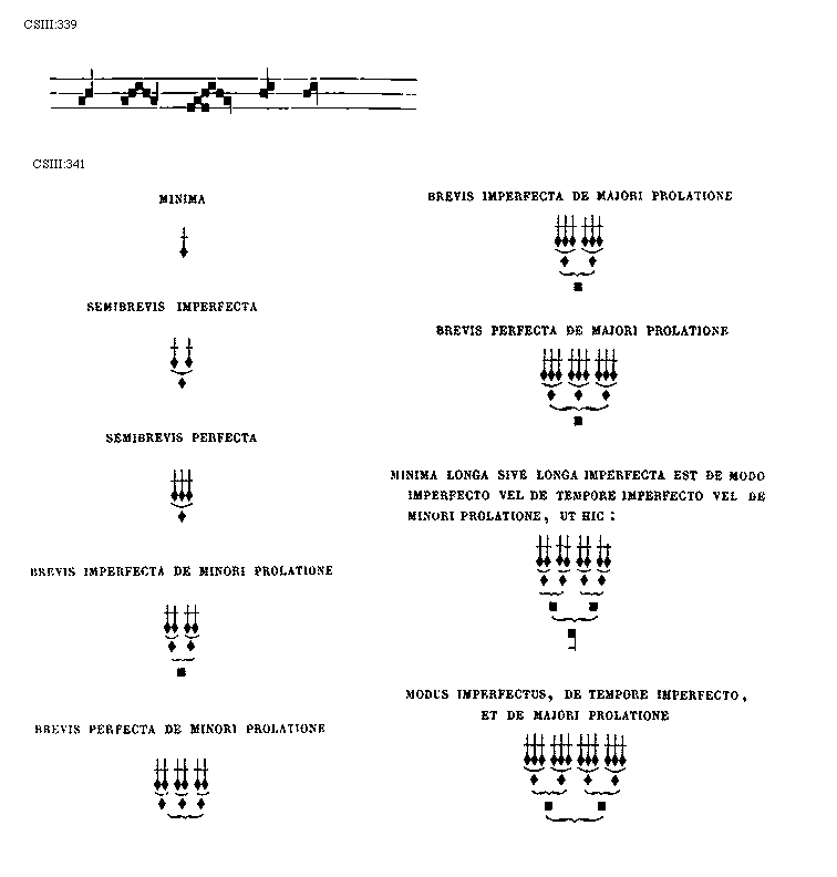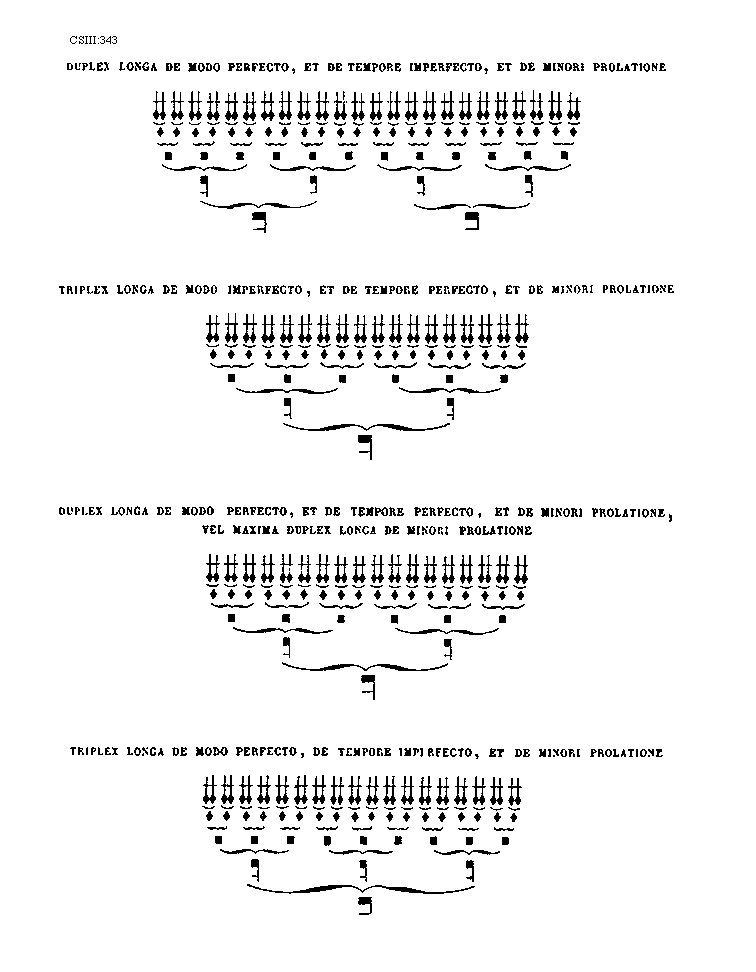 [343] [CSIII:343; text: Duplex longa de modo perfecto, et de tempore imperfecto, et de minori prolatione, Triplex longa de modo imperfecto, et de tempore perfecto, et de minori prolatione, Duplex longa de modo perfecto, et de tempore perfecto, et de minori prolatione, vel maxima duplex longa de minori prolatione, Triplex longa de modo perfecto, de tempore imperfecto, et de minori prolatione] [ANO1DEM 03GF]